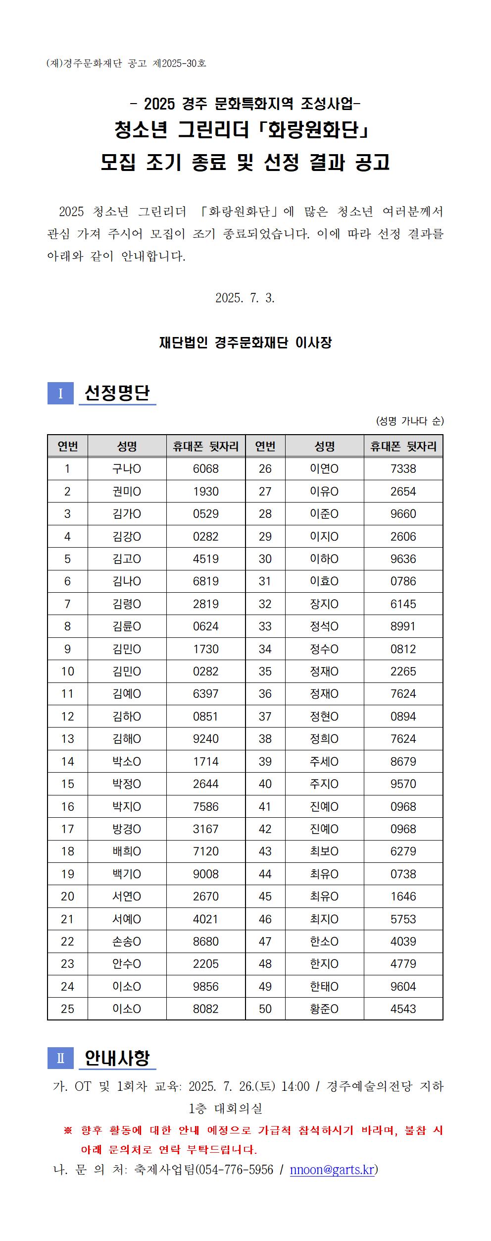 [공지사항] 2025 청소년 그린리더 <화랑원화단> 모집 조기 종료 및 선정 결과 공고