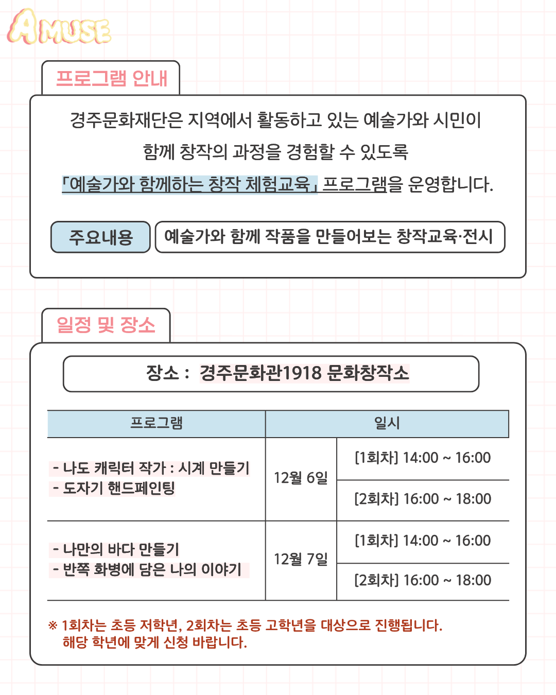 * 학년별 신청 안내: 1회차와 2회차는 학년별로 구분하여 운영되므로, 해당 학년에 맞게 신청해 주세요.