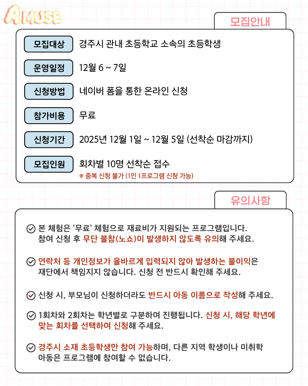* 참가 대상: 경주시 관내 초등학생만 참여 가능합니다. 다른 지역 학생이나 미취학 아동은 신청할 수 없습니다. 신청서에 적은 내용이 허위이거나 모집 조건에 맞지 않을 경우 신청이 취소될 수 있습니다.